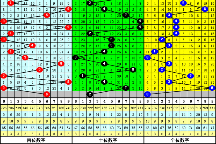 在连续10期开奖中,和值振幅分别为:15-0-5-6-3-12-0-8-9-0,逐渐下降,和值比较分散,本期预计和值波动较大,出现在小 号区域。