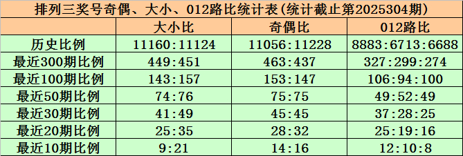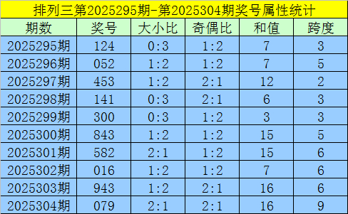上期回顾:排列三第2025304期出现奖号079。开出组六,奇偶比2:1,012路比2:1:0,大小比2:1,和值16,跨度9。