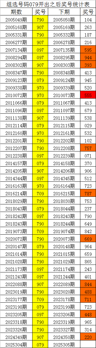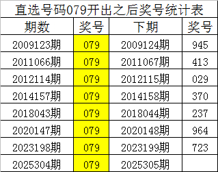 从上表统计可以看出,直选号码079开出之后,其下期奖号: